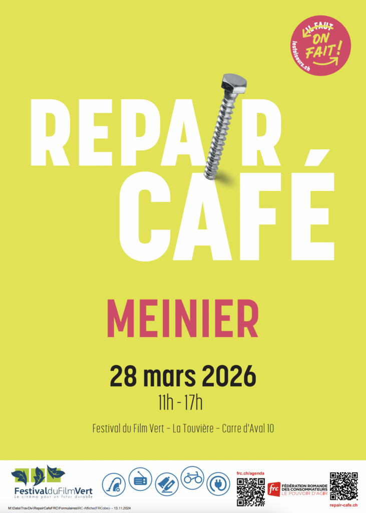 Repair café à la Touvière ! Date de l’article 28 mars 2026 Date/heure Date(s) - 28 mars 202611:00 - 17:00 Catégories Activité ponctuelle ← Rencontre d’avril → 21e Festival du Film Vert à la Touvière et animations